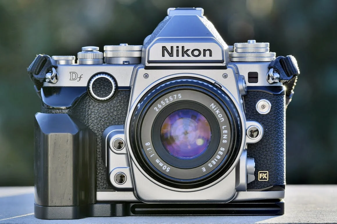 To wrażenie płynności przechodzenia między „analogowym” FA a cyfrowym Df wynika też z możliwości mocowania na tym ostatnim prawie każdego obiektywu, jaki Nikon wyprodukował od 1959 roku i uzyskania pomiaru światła. Kiepsko wyprofilowany uchwyt sprawia, że profesjonalne jasne zoomy nie są najlepszymi partnerami tego aparatu. Za to Df świetnie się czuje w towarzystwie małych manualnych stałek, które wyglądają na nim „na miejscu” i wydają się dopełniać stylistykę, podczas gdy na nowocześnie zaprojektowanych cyfrowych lustrzankach pokroju D5, D850 czy D750 wyglądają karykaturalnie. Aparat jest dość lekki i mały i mieści się do niewielkich toreb z zestawem kilku stałoogniskowych obiektywów, choćby z „ekonomicznej” optyki serii Nikon E z początku lat 80. XX wieku.