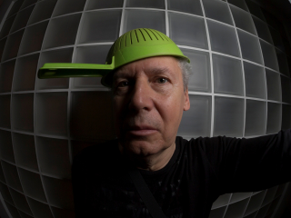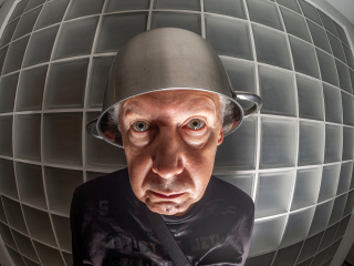 Ale rybie oko może też posłużyć do wykonywania autoportretów autoironicznych. Obiektyw typu rybie oko zniekształca jak zwierciadła w gabinecie luster i przy odpowiednio zrobionej minie i ustawieniu głowy względem przedniej soczewki efekty autoportretowe są dość karykaturalne. Musiałem nabrać dystansu do siebie, żeby niektóre z nich zaakceptować. Szczególnie na autoportrecie w garnku na głowie wyglądam jak skończony kretyn, ale jak powiedział dobry wojak Szwejk „— Posłusznie melduję,… że ja sam postrzegam na sobie nieraz oznaki idiotyzmu, osobliwie ku wieczorowi…” Jako, że robiłem te autoportrety wieczorem, wszystko się zgadza.