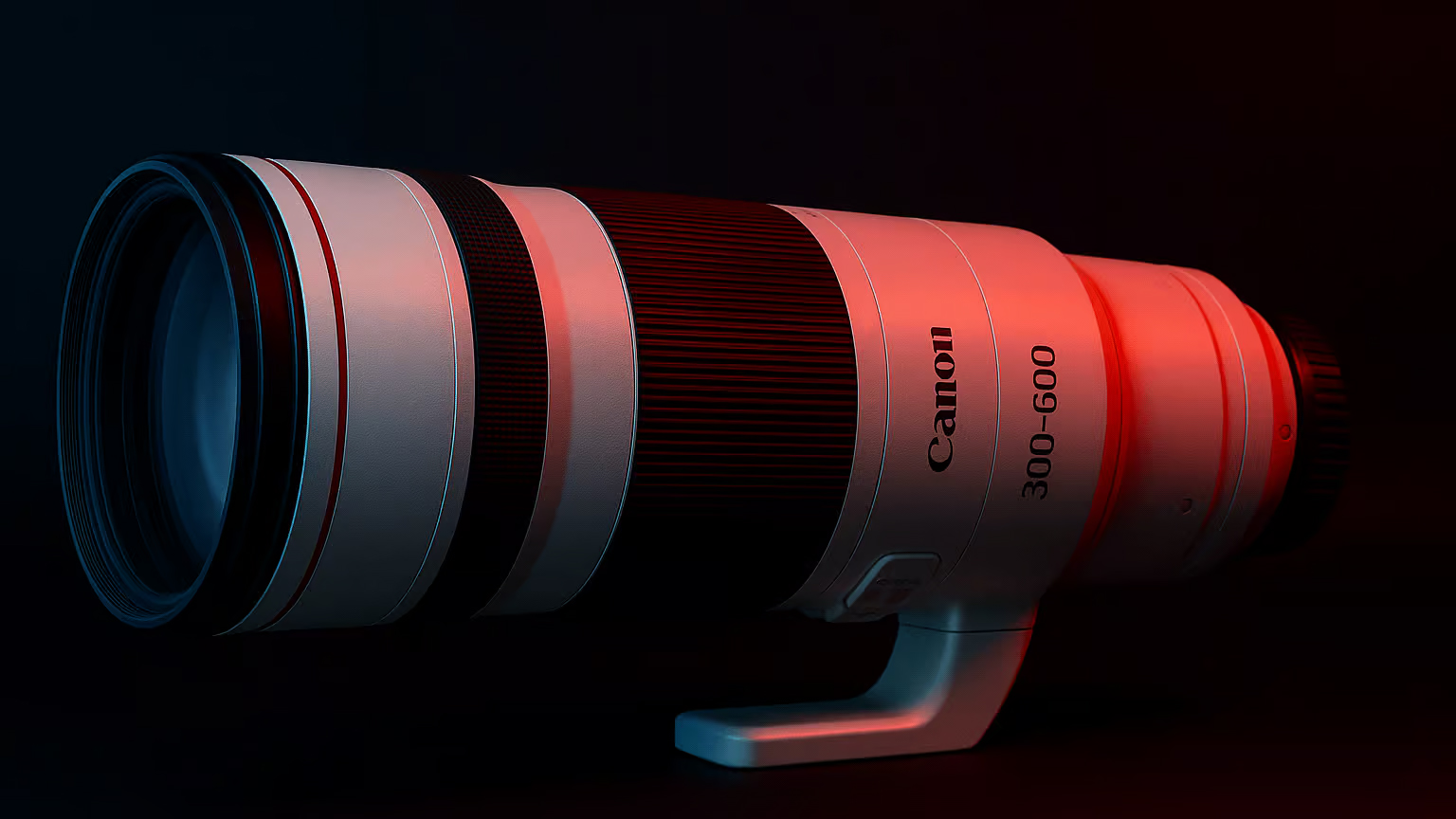 - W tle: Canon RF 300–600mm — możliwy następca długiego zooma dla zawodowców.