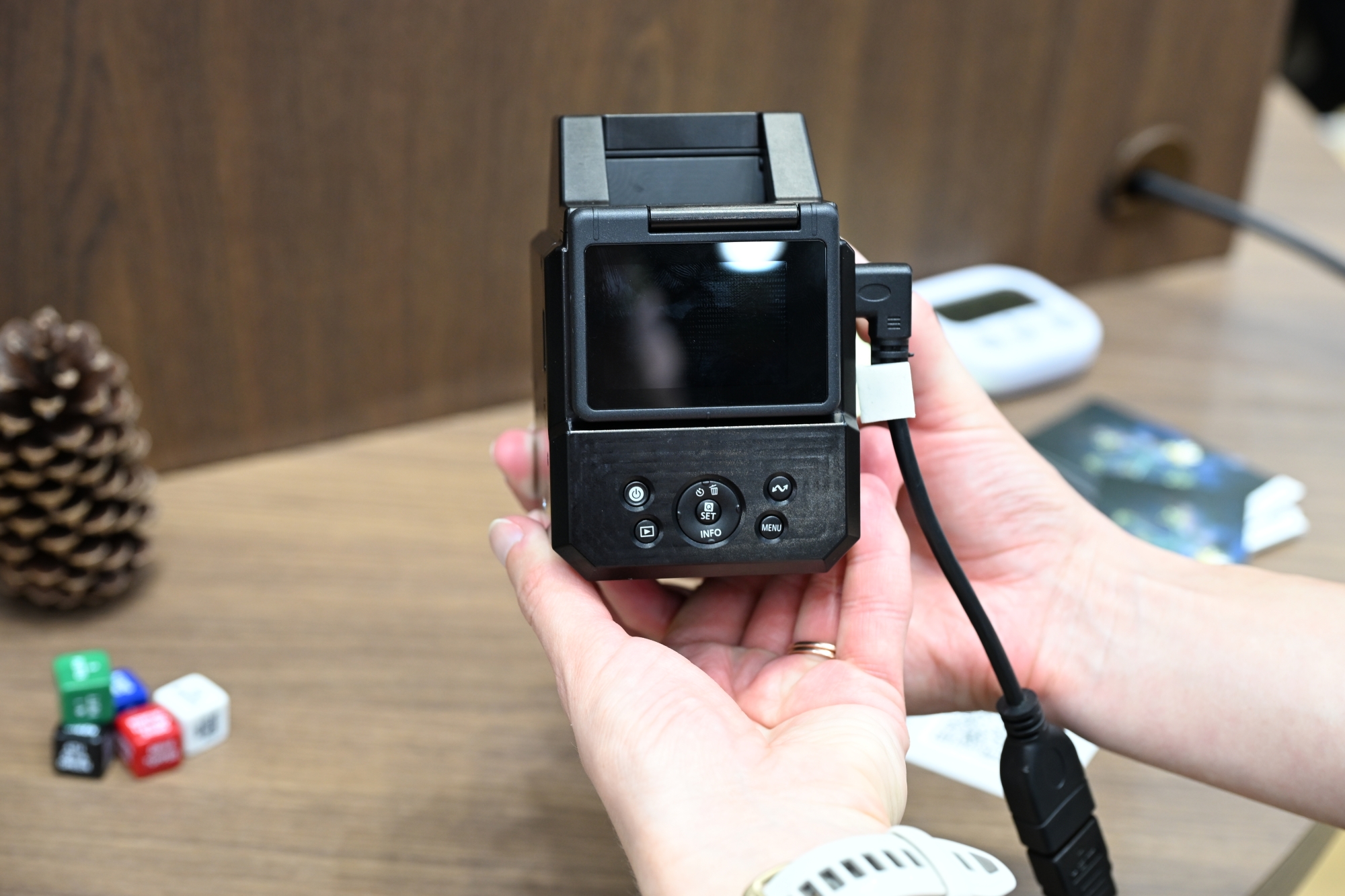 Egzemplarz, który można było wziąć do ręki, był daleki od finalnego produktu. Obudowa wyglądała momentami na częściowo drukowaną w 3D, ekran nie działał, a podgląd na żywo był wyświetlany na zewnętrznym monitorze podłączonym kablem.