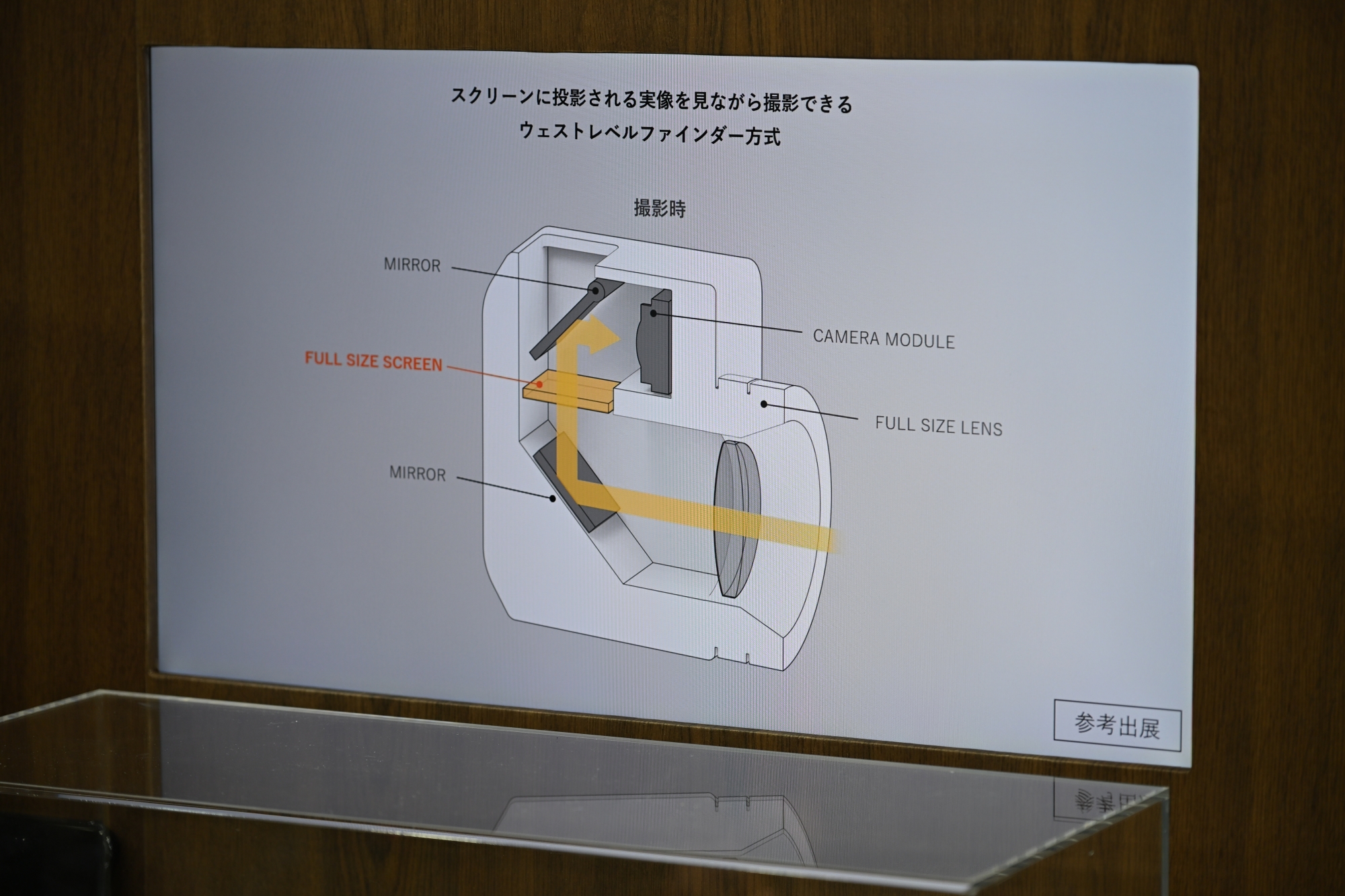 Canon idzie o krok dalej w metaforze. Według schematu prezentowanego na stoisku światło z obiektywu (manualny 50 mm ekwiwalent F1.8) odbija się od lustra i trafia do wizjera. Dopiero po przestawieniu dźwigni inne lustro kieruje światło na matrycę.